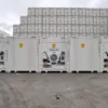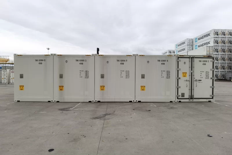 The 40’HC Cold Storage Complex consists of five 40 feet high cube units. 3 of them are refrigerated containers with Thermo king Cooling Machine. The other two are insulated containers. Two units only have one side wall and the other three do not come with walls at all. This arrangement enables the combination of these 5 units into one cold storage unit.